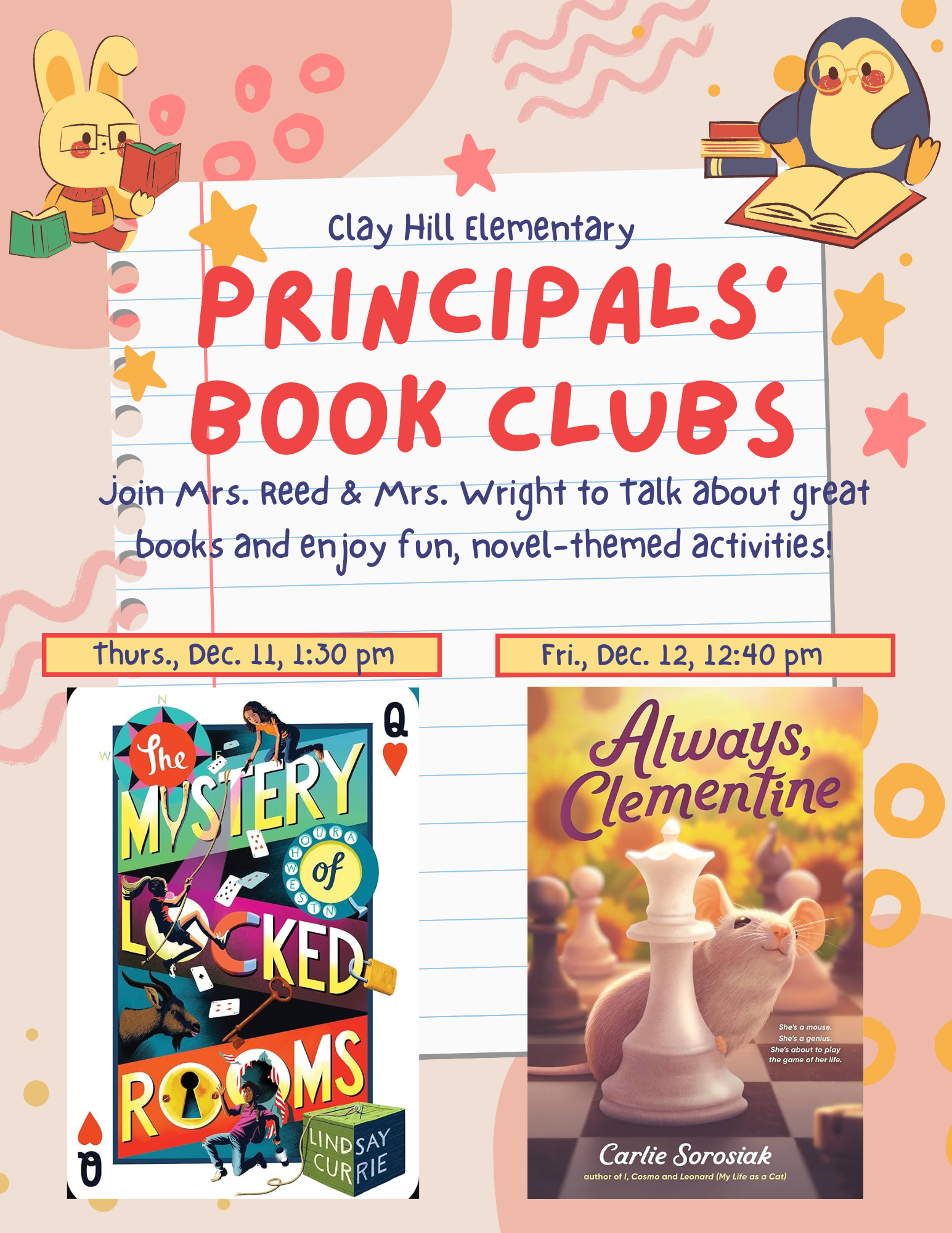 It's almost time for the quarter 2 Principals' Book Clubs! Mrs. Reed and Mrs. Wright will invite all students who read and pass the tests for these novels in Mrs. Lowans' Google Classroom to our December Book Clubs for book talk and text-themed activities. Don't miss the literary fun with The Mystery of Locked Rooms and Always Clementine!