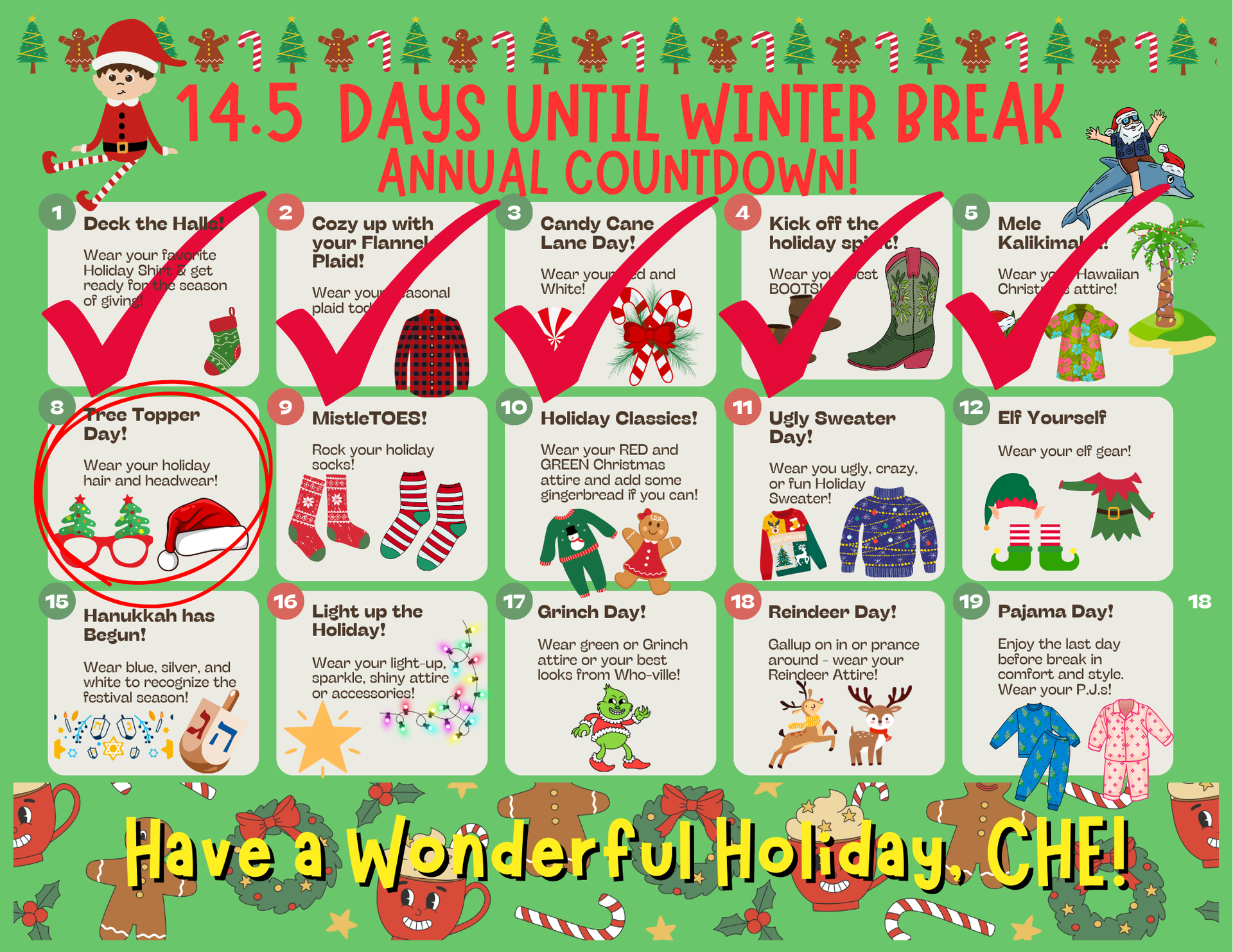 Of course, the seasonal fun and spirit continue this week with our daily themes, as well as our annual Visit with Santa and Chime Choir Concert this Thursday, December 11, starting at 5:00 pm. Come see Santa and enjoy holiday crafts and fun with our CHE family. We look forward to seeing you there!