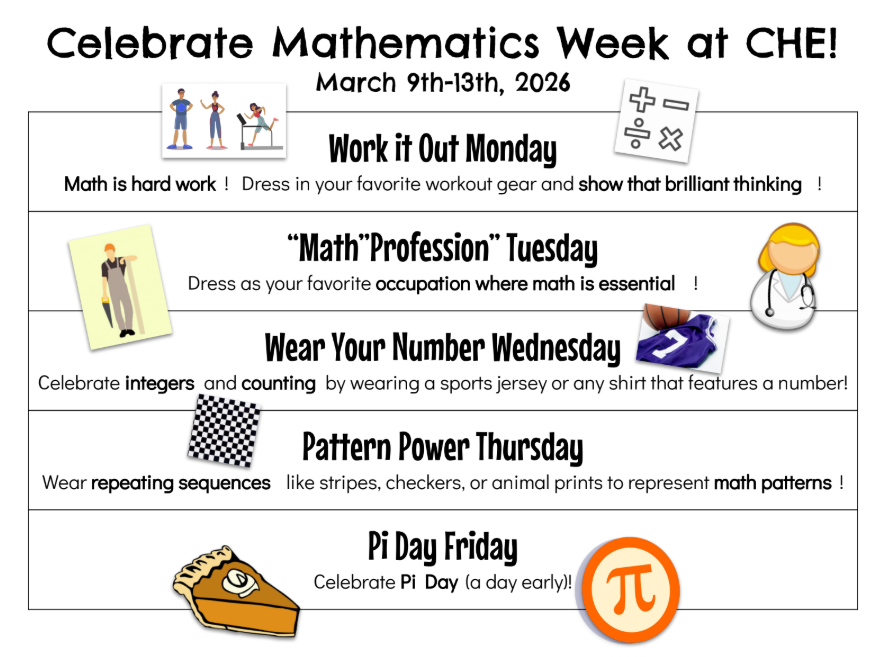 We are looking forward to an annual favorite at CHE: Math Week! From March 9-13, we will celebrate the magic of math and raise our students' awareness of math in the wold around us. Along with a variety of activities, we'll culminate the week with Pi Day (a day early) on Friday the 13th! Check out our daily dress up themes and embrace the JOY of math! Special thanks to Mrs. Tichinel and our intermediate math teacher team for coordinating! |