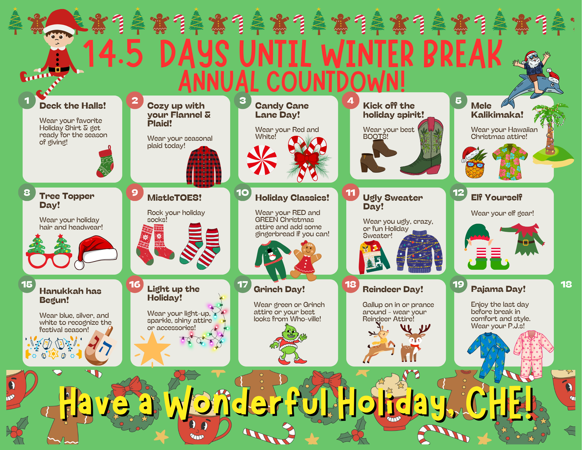 We wish your family a safe, relaxing, and joyous Thanksgiving filled with warmth and happy moments. We look forward to seeing our students back, refreshed, and ready to learn on Monday, December 1, when we will also be starting the administration of midyear progress monitoring assessments. Also, check out our Countdown to Christmas calendar, below, to join in on the holiday fun with daily, seasonal attire. Happy Thanksgiving! Warmly,