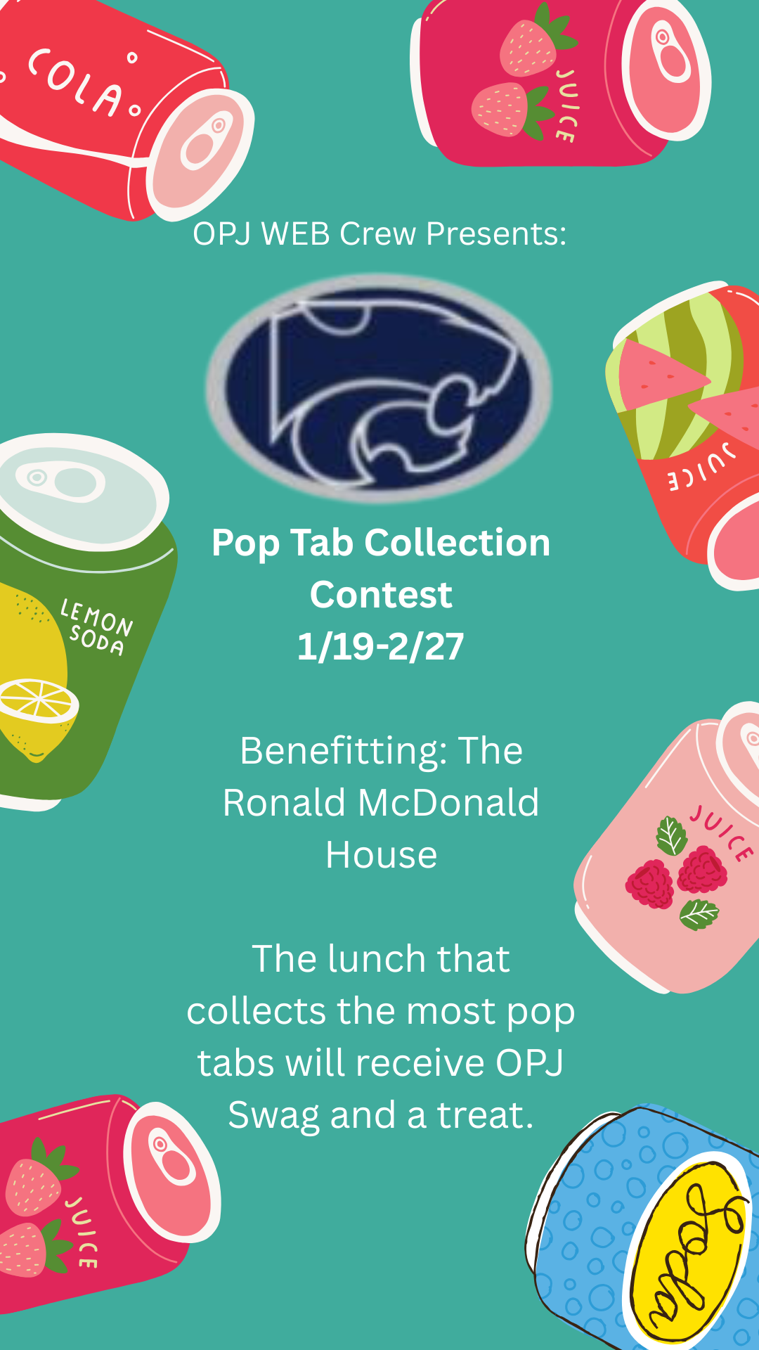 The OPJ WEB Crew is collecting pop tabs from 1/19-2/27 to benefit The Ronald McDonald House. The lunch that donates the most pop tabs will receive OPJ Swag and a treat.