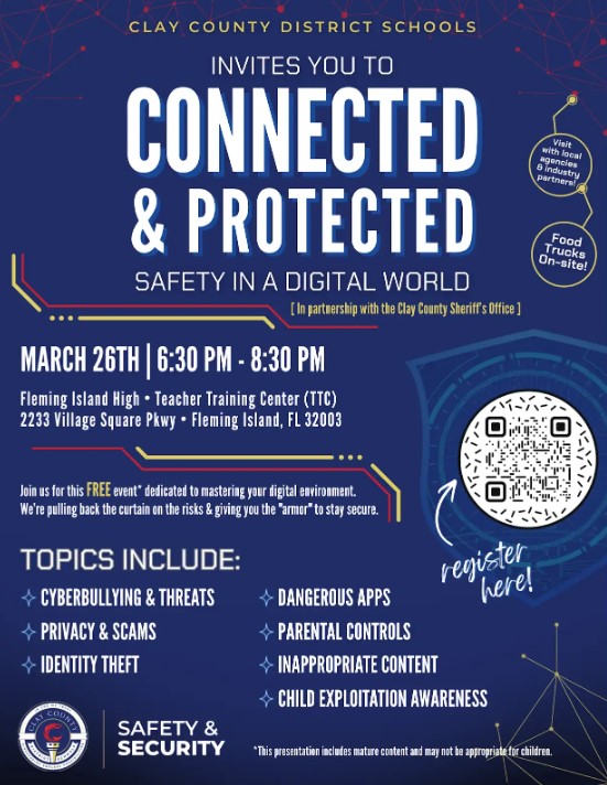 In today’s fast-paced digital landscape, keeping our students safe online is a top priority—but it isn’t always easy. Clay County District Schools and the Clay County Sheriff’s Office invite you to a special presentation: "Connected & Protected: Safety in a Digital World."