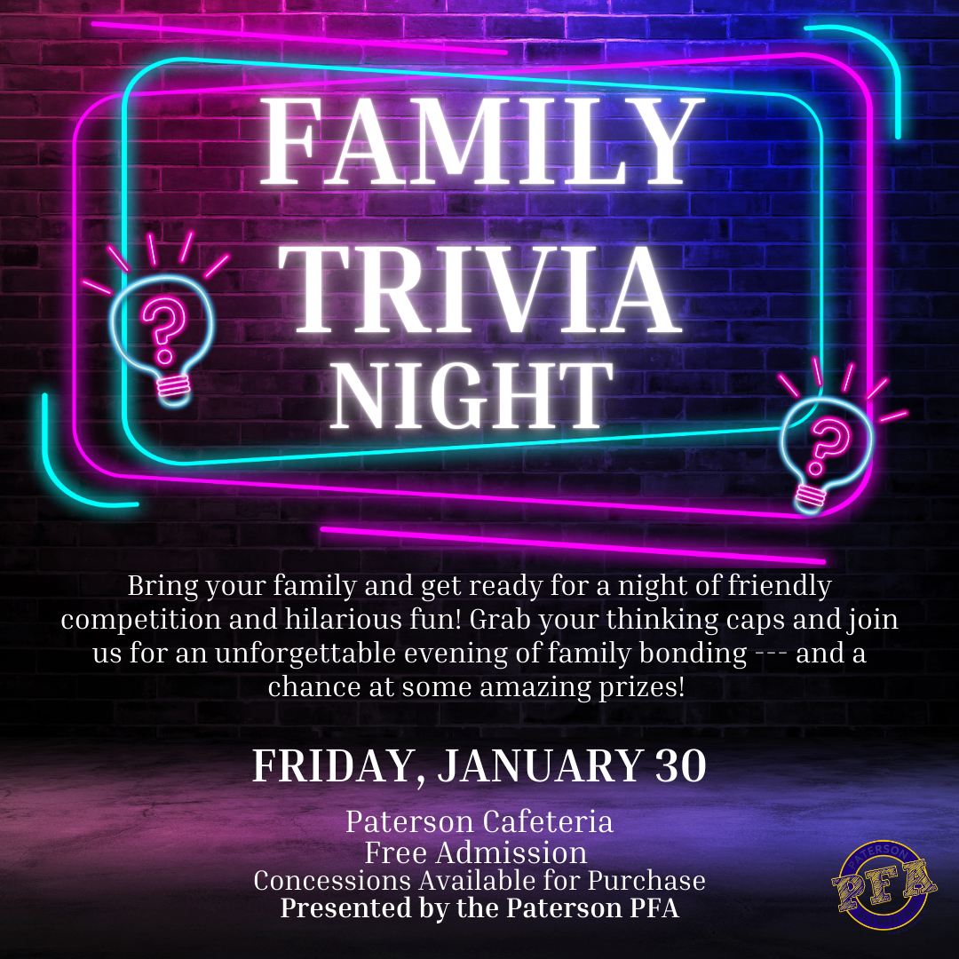 📅 Jan. 31: Family Trivia Night in the Paterson Cafeteria! More information to come.
