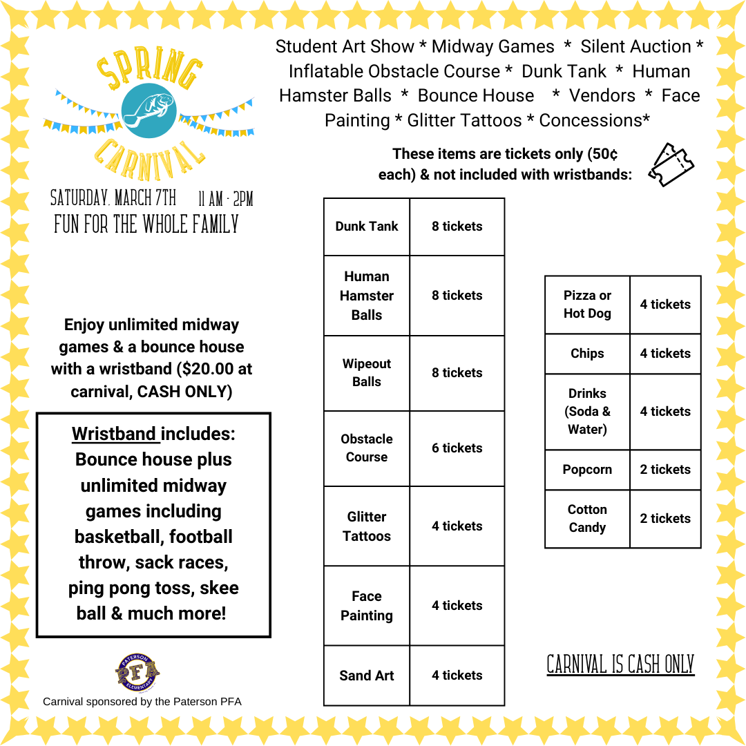 📅 Mar. 7th: Paterson Spring Carnival 11 to 2 📅 Mar. 11th: PFA Meeting & Board Nominations 📅 Mar. 16th -20th: Spring Break 📅 Mar. 23th: Teacher Planning Day/No School for our students 📅 Mar. 24th: Students return from Spring Break 📅 Mar. 27th: Report Cards Available to view in ParentVue 📅 April 1: Character Counts Luncheon—Citzenship 📅 April 3rd: Good Friday - Student & Teacher Holiday