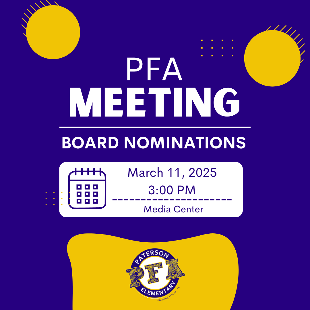 | PFA Meeting & Board Nominations Join us for our March meeting on March 11 at 3 PM in the Media Center. As always, children are welcome. We will nominate officers for our 2026-2027 school year at this meeting. We will be nominating the following positions: Coordinator, Assistant Coordinator, Secretary, Treasurer, Historian, and Parliamentarian.