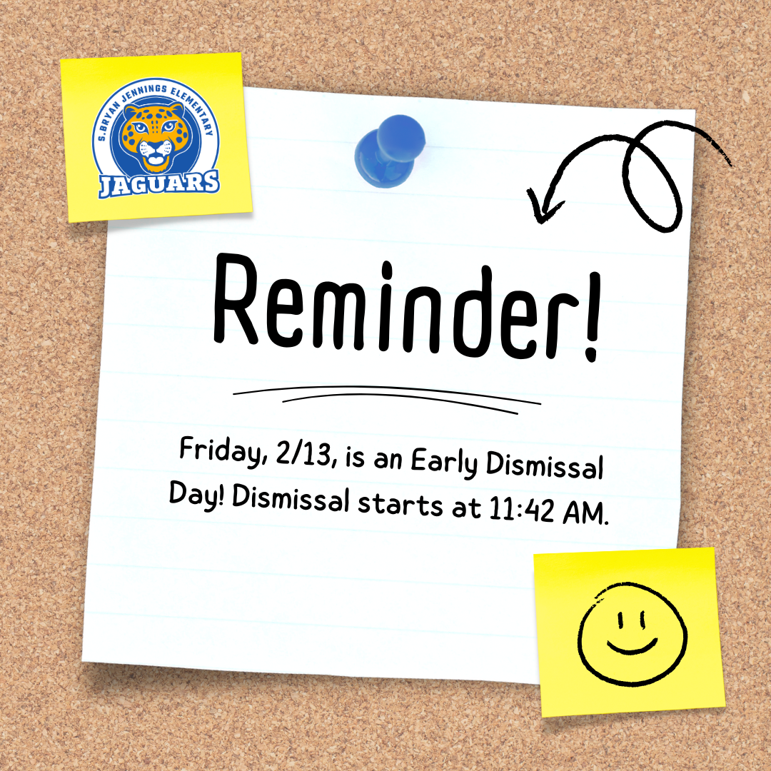 Friday, 2/13, is an early dismissal day! Dismissal starts at 11:42 and all students should be picked up by 12:00.